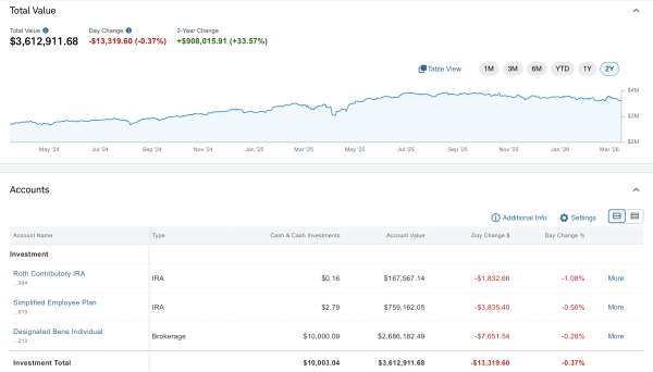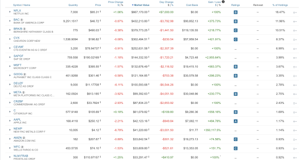 Trotz der Börsenturbulenzen ist mein Portfolio nach wie vor imposant, ich klopfe mir nicht gern selbst auf die Schulter. Das Gesamtvolumen liegt über 3,6 Millionen Dollar. Kontinuierlich befindet es sich im Aufwärtstrend in den letzten zwei Jahren. Hier zeigt sich ganz klar der Erfolg einer disziplinierten, langfristigen Herangehensweise. Die massiven prozentualen Zugewinne bei vielen Titeln (wie +583% bei Microsoft, +494% bei Apple oder +375% bei der Bank of America) beweisen, dass sich eine konsequente Buy-and-Hold-Strategie bei starken Unternehmen enorm auszahlt.