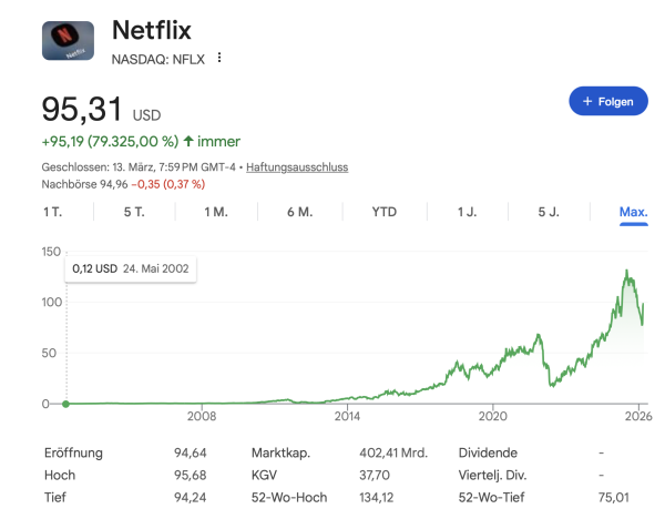 Hier siehst du die Kursentwicklung von Netflix. In den vergangenen Wochen stieg der Kurs wieder kräftig an, nachdem der Vorstand seinen Übernahmeversuch von Warner Bros. abgebrochen hat. So spart Netflix zig Milliarden.