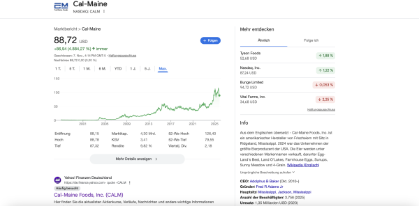 | Cal-Maine Foods | Kurs stark gefallen, geringes KGV | Starke Bilanz, Dividende fast 10% | über 1 Mrd. USD Cash, keine Schulden | Eierpreise sind volatil, Vogelgrippe |