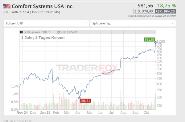 Am Donnerstag (23.10.2025) öffnete Comfort Systems erneut die Bücher und legte seine Quartalszahlen für das dritte Quartal vor – und pulverisierte sämtliche Erwartungen. Der Gewinn je Aktie (EPS) stieg um 102 Prozent auf 8,25 Dollar und übertraf damit die Prognosen von 6,25 Dollar deutlich. Die Erlöse kletterten um 35 Prozent auf 2,45 Milliarden Dollar und lagen ebenfalls über den Erwartungen von 2,13 Milliarden Dollar. Der operative Cashflow erhöhte sich außerdem kräftig um 83 Prozent auf 553 Millionen Dollar.