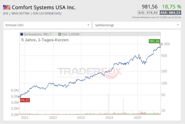 Die ganze Börsenwelt spricht über die Nvidia-Aktie – doch kaum jemand redet über Comfort Systems. Dabei ist sie definitiv einen Blick wert und braucht sich keineswegs zu verstecken. In den vergangenen fünf Jahren stieg der Kurs um beeindruckende 2.043 Prozent und übertraf damit sogar Nvidia, deren Aktie im selben Zeitraum „nur“ um 1.386 Prozent zulegte. Zudem überzeugte die Comfort-Systems-Aktie mit konstanten Kursgewinnen.