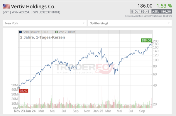 Der Kühlungs- und Stromspezialist Vertiv Holdings veröffentlichte ebenfalls in dieser Woche starke Quartalszahlen, woraufhin die Aktie auf ein Rekordhoch schoss. Ich hatte den Rechenzentren-Experten im April zu einem Kurs von 52 Euro nachgekauft.