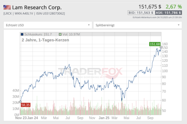 Anfang Januar kam es nach längerer Zeit wieder zu einer größeren Korrektur. Vom Januar-Hoch bei 550 Dollar fiel die Aktie bis April um fast die Hälfte auf 276 Dollar. Anschließend startete eine dynamische Aufwärtsrallye: Nach den Q2-Zahlen Ende Juli legte der Kurs um über 20 Prozent zu, und nach den Q3-Zahlen nochmals um satte 19 Prozent. Kürzlich erreichte die Aktie mit 1.002 Dollar ein neues Allzeithoch und knackte erstmals die 1.000-Dollar-Marke. Seit dem April-Tief ist der Kurs damit um über 250 Prozent gestiegen, und seit Jahresbeginn liegt er 129 Prozent im Plus.