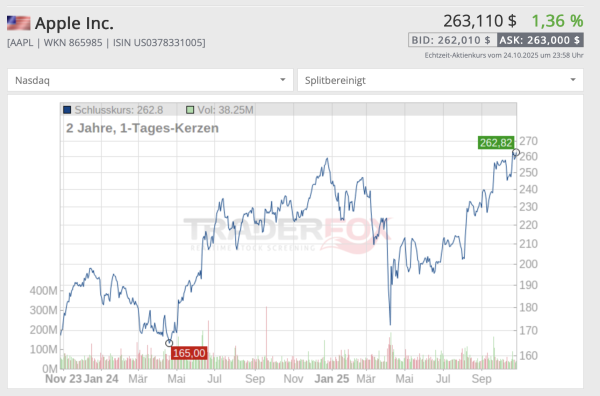 Mein Depotschwergewicht Apple erreichte ebenfalls, angetrieben durch die starke iPhone-Nachfrage, ein neues Allzeithoch. Die Auslieferungen für das iPhone 17 liegen deutlich über den Erwartungen, das Display ist besser, ebenso die Kamera.