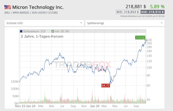 Der Speicherhersteller Micron legte ebenfalls seit April eine starke Rallye hin und erreichte neue Höchststände. Ich habe im April nachgekauft und bin 200 Prozent im Plus.