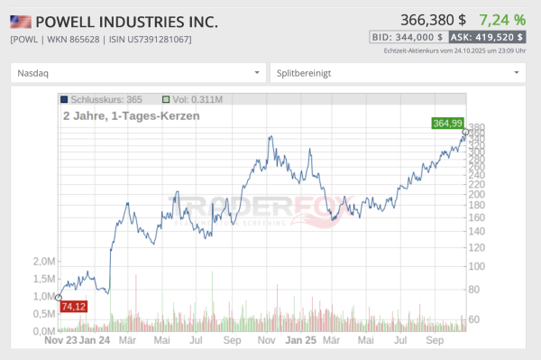 Auch die Aktie von Powell Industries hat einen richtigen Lauf und steht auf Allzeithoch. Die Aktie habe ich im letzten Jahr gekauft. Im April habe ich Powell noch mal nachgekauft.
