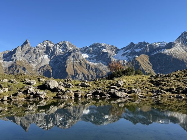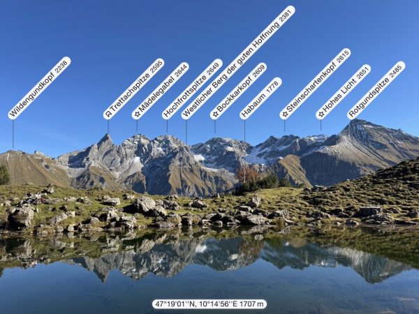 Der Allgäuer Hauptkamm spiegelt sich im Guggersee.