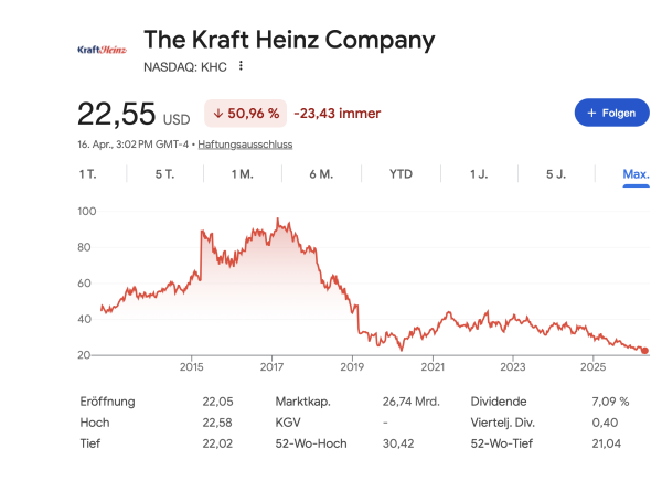 Es ist kein Geheimnis, dass Kraft Heinz in der Vergangenheit Probleme hatte. Das extreme Kostensparen unter dem Management von 3G Capital hat der Innovationskraft geschadet, und der Schuldenberg war immens. Aber das Management steuert längst gegen. Die Schulden werden abgebaut, es wird wieder in Werbung und die Marken investiert. Heinz Ketchup, Philadelphia oder Kraft Mac & Cheese verschwinden nicht aus den Regalen. Warren Buffett hält nicht ohne Grund an seinem riesigen Aktienpaket fest. Bei den stark gedrückten Kursen winkt hier eine fette Dividendenrendite. Wer Geduld mitbringt, wird fürs Warten fürstlich bezahlt.