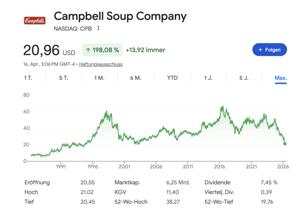Suppen und Snacks. Es gibt kaum ein Geschäftsmodell, das weniger sexy ist als das von Campbell Soup. Aber genau solche langweiligen, leicht verständlichen Geschäfte sind es, die langfristig Reichtum aufbauen. Campbell hat eine gigantische Preissetzungsmacht. Natürlich fluktuiert der Absatz leicht, wenn die Preise im Supermarkt steigen, aber die Dosen wandern am Ende trotzdem in den Einkaufswagen. Die aktuelle Schwächephase des Aktienkurses ist für Langfristanleger eine Einladung.