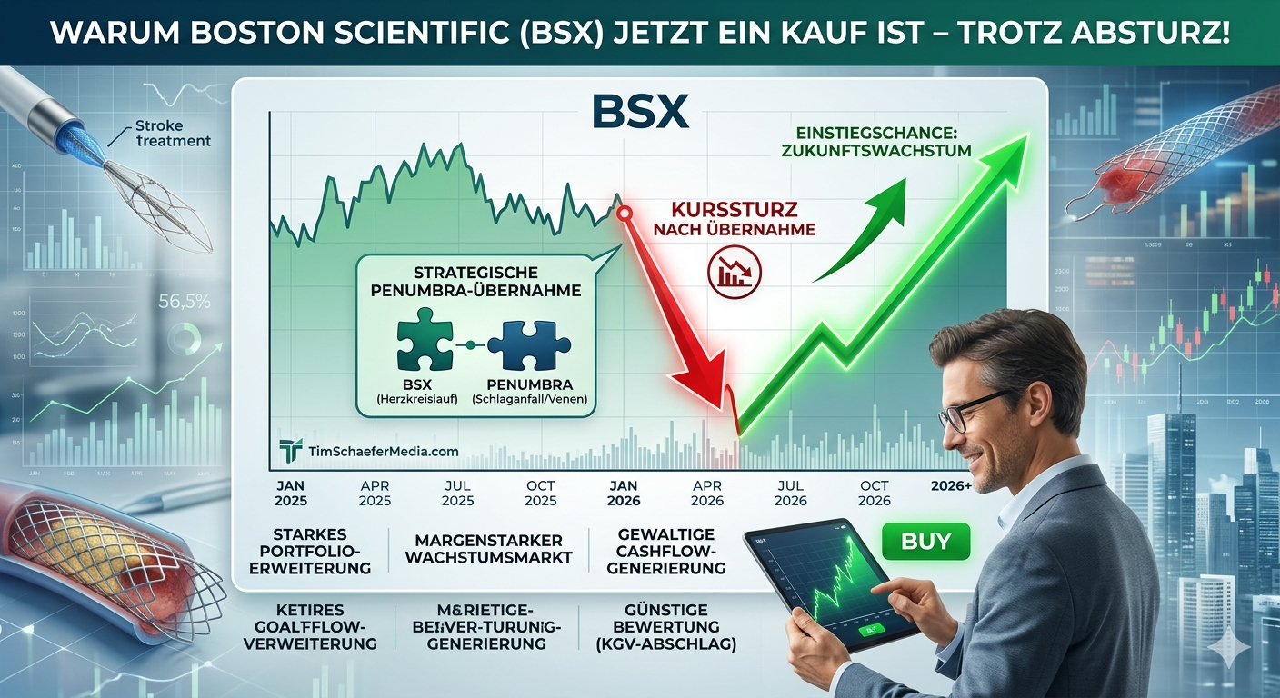 Die Wall Street ist extrem kurzsichtig. Sobald eine kleine Wolke am Horizont auftaucht, werfen nervöse Anleger ihre Papiere auf den Markt. Nach dem Motto: Ene, Mene, Muh und raus bist du. Genau das haben wir Anfang des Jahres bei Boston Scientific (BSX) erlebt. Nach der Ankündigung der milliardenschweren Übernahme von Penumbra und einem Ausblick, der die Analysten für das Jahr 2026 leicht enttäuschte, brach die Aktie im Februar an einem einzigen Tag um fast 18 Prozent ein. Boa! Da brauchst du starke Nerven, um das auszuhalten.