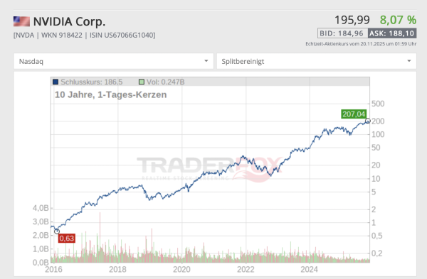 Nvidia gehört zu den absoluten Überfliegern an der Börse. In den letzten zehn Jahren legte der Kurs um rund 25.000 Prozent zu – das entspricht einer jährlichen Rendite von knapp 74 Prozent. Kein anderes Unternehmen aus dem Nasdaq 100 hat eine vergleichbare Performance erzielt. Allein in den vergangenen drei Jahren hat sich der Kurs verzehnfacht. Vor kurzem erreichte Nvidia zudem als erstes Unternehmen die Marke von 5 Billionen Dollar.