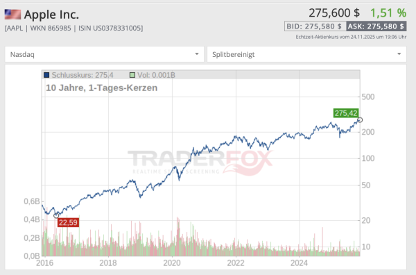 Die Apple-Aktie lieferte in den letzten zehn Jahren eine hervorragende Rendite und hat sich in diesem Zeitraum verzehnfacht. Auch in diesem Jahr erreichte die Aktie neue Höhen und überschritt vor Kurzem erstmals eine Marktkapitalisierung von 4 Billionen Dollar.