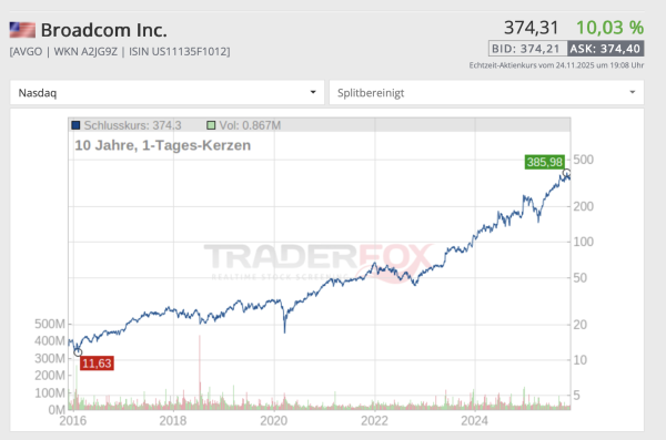 Broadcom erzielte in den vergangenen Jahren eine eindrucksvolle Rendite. Im Jahr 2023 kletterte die Aktie um 95 Prozent, und im Jahr 2024 legte sie um weitere 125 Prozent zu. Auch in diesem Jahr steht sie bislang wieder 48 Prozent im Plus.