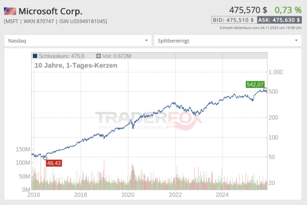 Microsoft dominiert weiterhin Bürosoftware und Cloud mit Azure und Microsoft 365. Durch die enge Partnerschaft mit OpenAI und Milliarden-Investitionen in KI-Infrastruktur ist Azure zur bevorzugten Plattform für Unternehmens-KI geworden. Tools wie Copilot durchdringen Office, GitHub und Windows, während die Microsoft Cloud unaufhaltsam wächst. Das Unternehmen bleibt damit einer der größten und stabilsten Profiteure der gesamten KI-Revolution. Mit der Activision-Übernahme hat Microsoft seine Stellung im Gamingmarkt stark ausgebaut. Für mich ist Microsoft ein Basisinvestment.