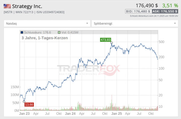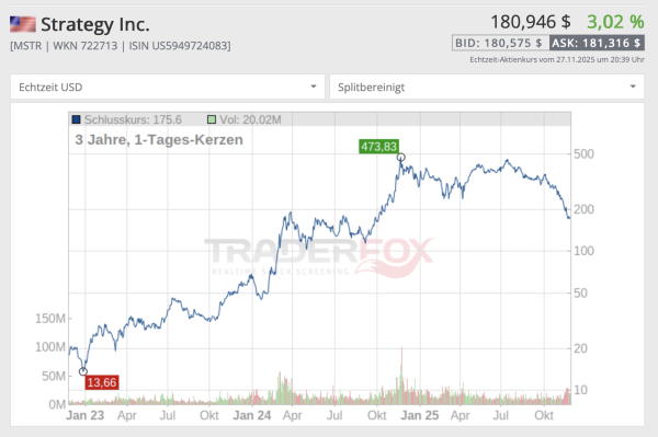 Seitdem Strategy die Bitcoin-Strategie verfolgt, ist die Aktie um 1.400 Prozent gestiegen. In diesem Jahr ist sie jedoch deutlich unter Druck geraten: Durch den schwachen Bitcoin liegt die Aktie seit Jahresbeginn 41 Prozent im Minus.