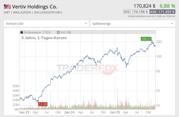 Die Vertiv-Aktie hat sich in den letzten drei Jahren mehr als verzehnfacht. Auch in diesem Jahr ist sie nach dem sogenannten „Trump-Crash“ stark zurückgekommen. Ich habe die Aktie erstmals 2024 gekauft und im April dieses Jahres während des Crashs noch einmal massiv nachgekauft.