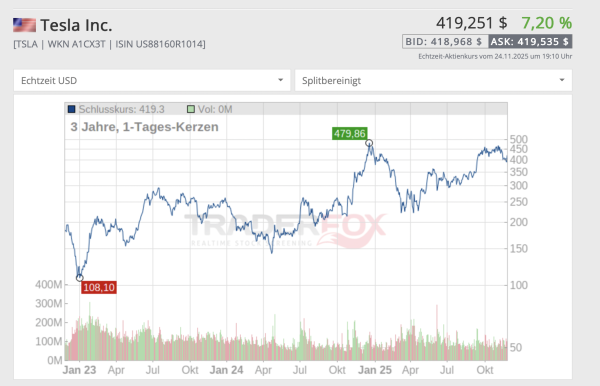 Die Tesla-Aktie war in den letzten zehn Jahren sehr volatil, und man musste immer wieder teils erhebliche Abschläge hinnehmen. Insgesamt stieg die Aktie jedoch um satte 3.000 Prozent. Nur wenige Unternehmen erzielten eine bessere Performance. Aktuell bewegt sich die Aktie wieder in Richtung ihres Allzeithochs.