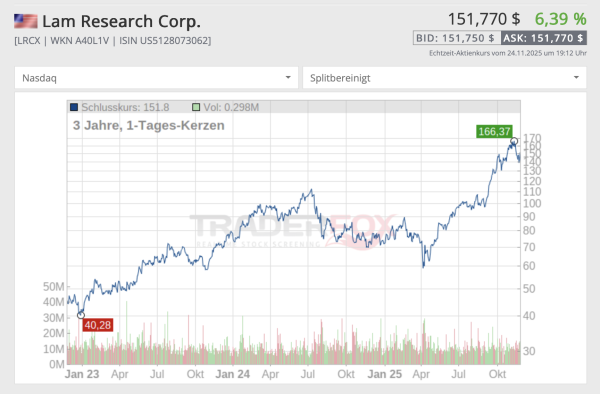 In den letzten zehn Jahren ist die Aktie von Lam Research um satte 1.950 Prozent gestiegen. Auch in diesem Jahr liegt sie bislang 120 Prozent im Plus.