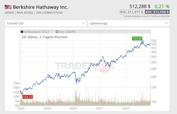 In den letzten 10 Jahren stieg der Kurs von Berkshire um 287 Prozent und entwickelte sich sehr stabil nach oben. Mit großen Cashreserven hat die Aktie von Buffett einen eingebauten Krisenschutz.