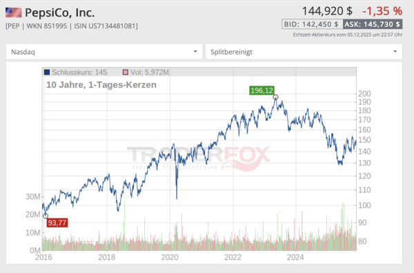 Die defensive PepsiCo-Aktie ist aktuell meine viertschlechteste Position. Ich liege 14 Prozent im Minus, kaufe aber regelmäßig per Sparplan nach und erhalte Dividenden. Hier mache ich mir überhaupt keine Sorgen – die Aktie wird sich auf jeden Fall wieder erholen.