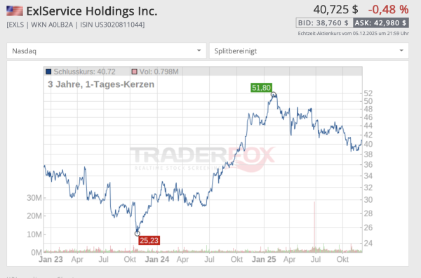 ExlService Holdings ist mit einem Verlust von 16 Prozent meine drittschlechteste Aktie. Seit Anfang 2025 befindet sich die Aktie in einer Korrektur, und ich denke über einen Nachkauf nach.