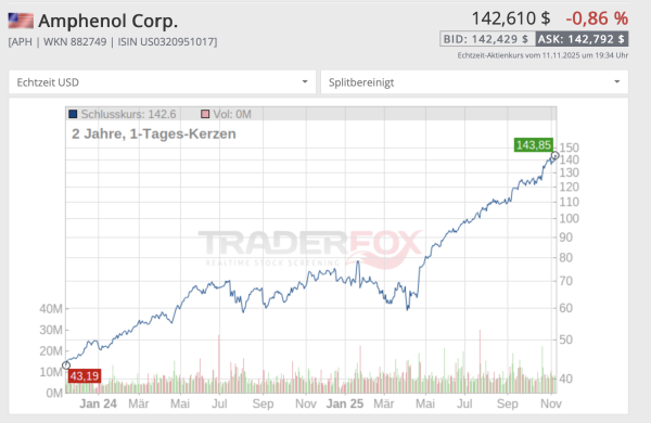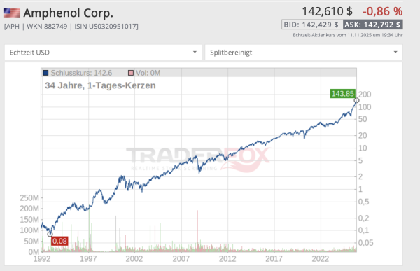 Amphenol ist für mich ein echter, oft vergessener Technologiewert. Die meisten denken bei Tech an NVIDIA, Broadcom oder Apple – aber ohne Amphenols Stecker und Kabel läuft nichts. Das Unternehmen ist mitten in den großen Zukunftsmärkten aktiv: KI-Server, 5G-Netze, Elektroautos und moderne Industrie. Alles, was Daten überträgt, braucht ihre Technik – und die Nachfrage wird in den nächsten Jahren massiv wachsen. Amphenol ist ein echter Nischen-Player.