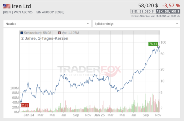 Neuen Schwung bekam die Aktie Anfang November, als der Softwareriese Microsoft einen 10-Milliarden-Dollar-Deal mit dem Unternehmen abschloss. Das ist ein echter Ritterschlag, und in Zukunft können möglicherweise weitere Kooperationen mit Hyperscalern wie Amazon oder Alphabet folgen – was IREN einen erheblichen Wachstumsschub verleihen würde.