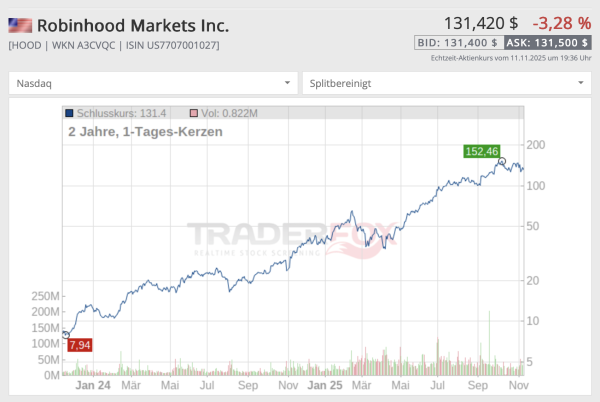 Der erste Wert ist die Robinhood-Aktie, die ich hier bereits vorgestellt habe. Ich sehe darin ein recht aussichtsreiches und spannendes Investment. Die Aktie gehörte in diesem Jahr zu den besten Performern und steht bereits 220 Prozent im Plus. Mein Nachkauf liegt inzwischen gut 20 Prozent im Plus. Für diese Position habe ich die Hälfte des aus Adobe freigewordenen Kapitals verwendet.