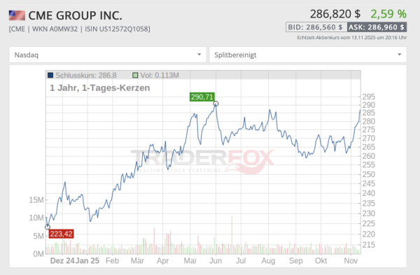 In Krisenzeiten werden mehr Optionen, Futures und ähnliche Produkte gehandelt. CME reagiert in Krisen deshalb robust, was sich im stabilen Langfristchart widerspiegelt. Auch in diesem Jahr erwies sich die Aktie als krisenresistent: Während der Zollkrise im Frühjahr legte sie kräftig zu.