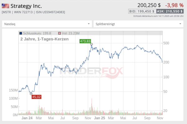 Strategy wirkt wie ein Hebel auf den Bitcoin. Durch den momentanen Abwärtstrend bei der Kryptowährung wirkt der Hebel nun in die andere Richtung und die Strategy-Aktie verliert deutlich stärker.