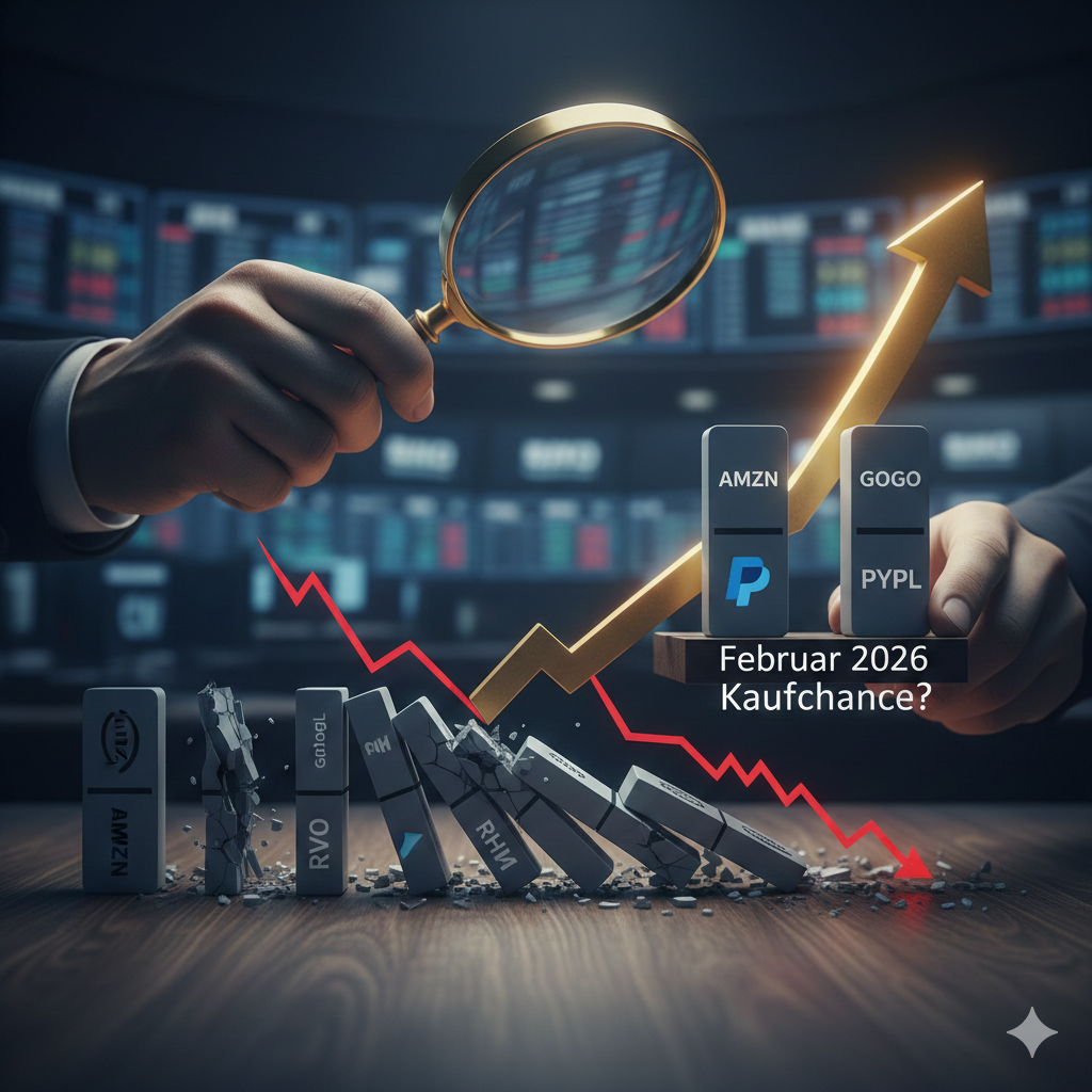 • Der Grund: Ein „Schock“ über die massiven Investitionen (Capex) schickte beide Aktien nach unten. Das Duo kündigten an, 2026 bis zu 185 respektive 200 Milliarden Dollar für KI-Infrastruktur auszugeben. Der Markt fragt sich: „Wann zahlt sich das aus?“ und straft die Aktien für die hohen Kosten ab. Amazon rauschte vom Top bei 254 auf 204 Dollar.