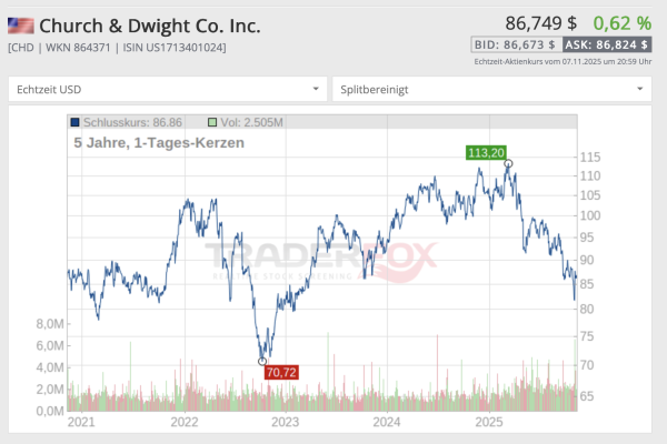 In den letzten 5 Jahren ist Church & Dwight nicht mehr wirklich von der Stelle gekommen die Aktie befindet sich seither 2 Prozent im Minus. Seit Anfang des Jahres befindet sich die Aktie in einem durchgehenden Abwärtstrend.