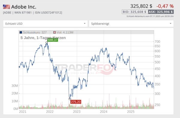 Die Adobe-Aktie hat in den letzten fünf Jahren kaum performt. In diesem Zeitraum liegt sie rund 30 Prozent im Minus. Im selben Zeitraum hat sich hingegen der Nasdaq 100 verdoppelt, und einige Techwerte wie Nvidia (hier mein letzter Artikel), Broadcom und Co. haben sich sogar vervielfacht.