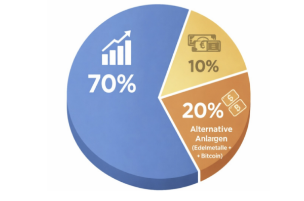 70% Aktien, 10% Cash und 20% alternative Anlagen (Edelmetalle + Bitcoin).