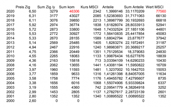 Im Anhang das überschlägige Ergebnis: 46.000 Euro gespart und bei Anlage in einen MSCI wäre daraus 77.000 Euro geworden. Hier ist die Excel-Kalkulation zum Abrufen: Zigaretten