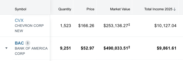 - Warum ich sie liebe: Sie ist „too big to fail“ und extrem profitabel, wenn die Wirtschaft läuft. Die Bewertung ist oft moderat, die Dividende wächst wieder. Ein Basis-Investment im Finanzsektor. Ich habe die meisten Bankaktien während der Finanzkrise zu Schnäppchenpreisen weit unter Buchwert gekauft. Knapp 10.000 Dollar habe ich von der Bank of America an Dividenden in 2025 kassiert.