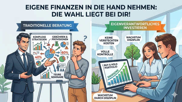 Wir brauchen nicht zum „Berater“ bei der Volksbank, Sparkasse, Postbank oder Commerzbank zu gehen. Und nicht zur Bausparkasse oder Versicherung. Die Bafin weist schon seit einiger Zeit auf die Interessenkonflikte dieser Verkäufer hin. Es fließen nämlich zum Teil heftige Provisionen im Hintergrund. Und die Produkte können verdammt teuer sein. Doch viele gehen genau dorthin und vertrauen den Verkäufern. Wenn du dich dort nach Aktien erkundigst, wollen sie dir vermutlich einen aktiv gemanagten Fonds oder andere fragwürdige Produkte andrehen. Ich rate dir, erst gar nicht dorthin zu gehen.