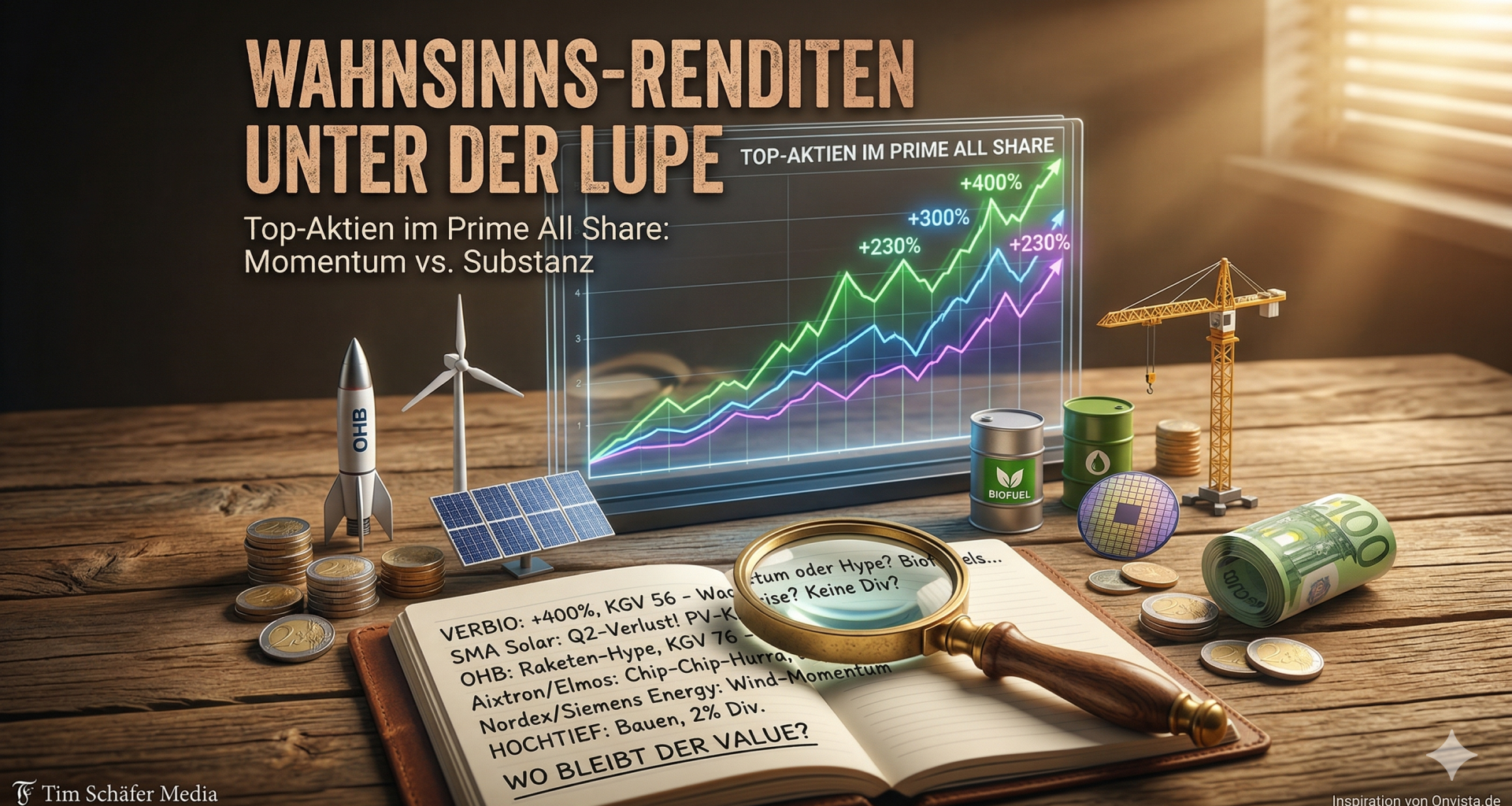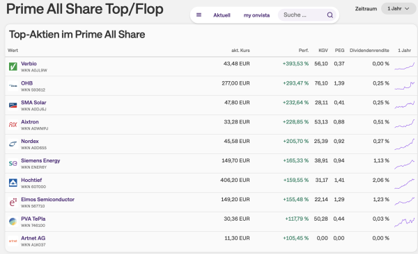 Ein aktueller Blick auf die Auswertung von Onvista zeigt die Top-Aktien aus dem Prime All Share Index auf Sicht eines Jahres. Und was soll ich sagen? Die Zahlen sind atemberaubend. Hier sehen wir Unternehmen, die sich in nur zwölf Monaten teilweise vervielfacht haben.
