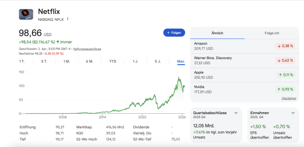 - Warum die Aktie jetzt mega spannend ist: Netflix ist längst nicht mehr nur ein reines „Wachstums-Startup“, das Cash verbrennt, sondern eine hochprofitable Cash-Maschine. Auf dem aktuellen Kurslevel wird Netflix mit einem attraktiven PEG-Ratio von nur knapp 1,3 gehandelt – ein Abschlag von über 20% im Vergleich zum historischen Durchschnitt. Das Unternehmen investiert 2026 gigantische 20 Milliarden Dollar in neuen Content, womit kein Wettbewerber auch nur im Ansatz mithalten kann. Wer jetzt einsteigt, bekommt den dominantesten Player im Streaming-Markt, der seine unangefochtene Marktmacht nun gezielt in sprudelnde Gewinne und freien Cashflow umwandelt. Im vergangenen Jahr stieg der Umsatz von rund 39,0 auf 45,2 Milliarden, der Gewinn von 8,7 auf 11 Milliarden Dollar.