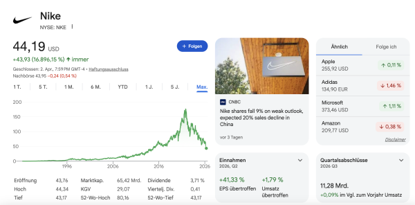 Nike hat gerade massiv Prügel bezogen. Nach der Veröffentlichung der Zahlen für das fiskalische dritte Quartal 2026 rutschte die Aktie an einem einzigen Tag um über 15% ab und fiel tief unter die 50-Dollar-Marke (aktuelle 44 Dollar) – meilenweit entfernt von den alten Hochs aus 2021.